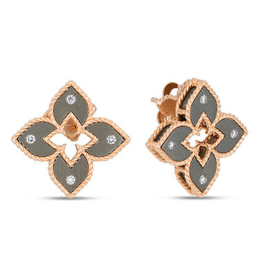 A grey shade of titanium gives uniqueness to these romantic earrings by Roberto Coin, featuring 18kt rose gold, diamonds and the magnificence of a handmade jewel.