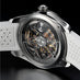 Solid steel case. Domed sapphire crystal. See-through case-back. Screw-in crown adorned with an "M". White rubber strap with steel pin buckle, engraved with the H. Moser & Cie. logo. -
