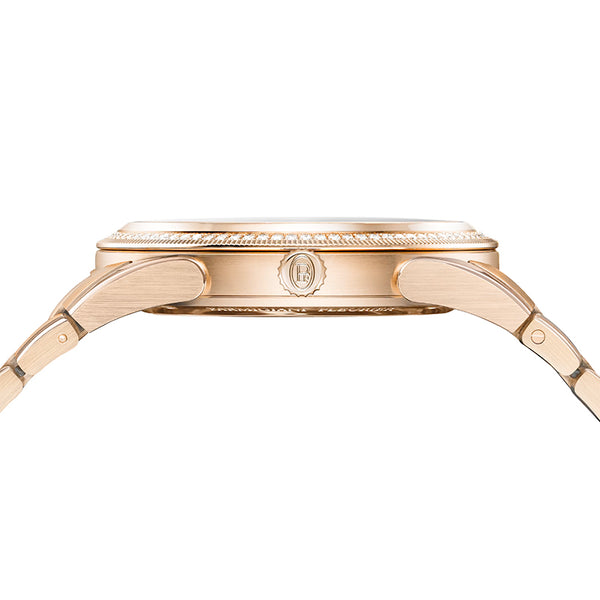 18ct rose gold case with diamond-set bezel. ARunic anti-reflective sapphire. Sapphire caseback. 18ct rose gold bracelet. -