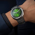 The emblematic Streamliner Centre Seconds returns in its original Matrix Green fumé dial, with a number of evolutions. The H. Moser & Cie. logo is now applied with transparent lacquer, adding to the minimalistic elegance of the integrated mono-link steel bracelet design. Powered by the HMC 201 automatic manufacture calibre, with a more open architecture, a fully skeletonised gold rotor and sleek grey tones.